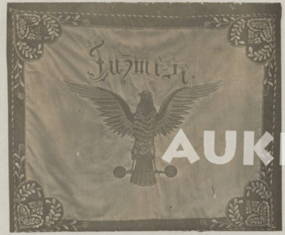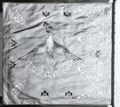 župní prapor z roku 1910, oboustranný, rozměr 110 cm x 97 cm, upevnění na žerdi pomocí tunelu