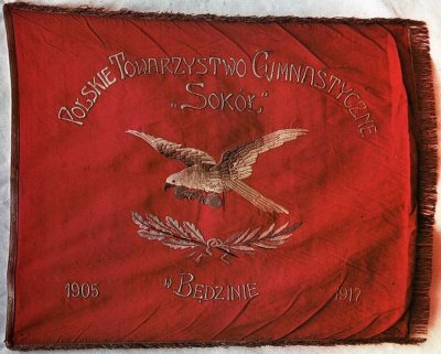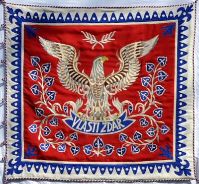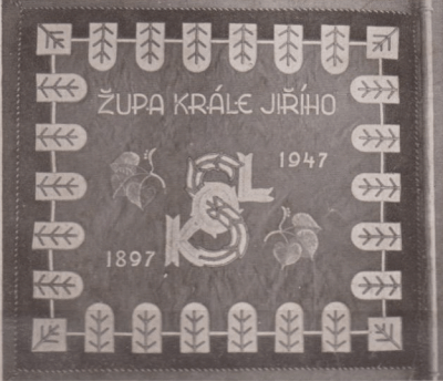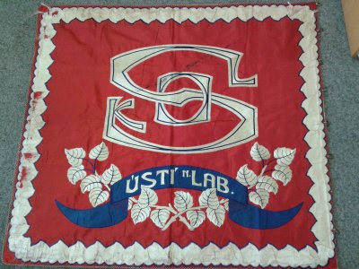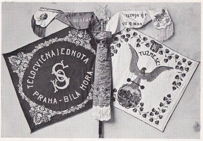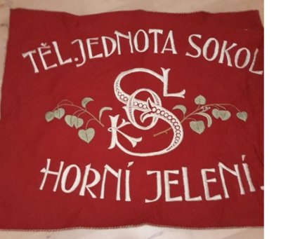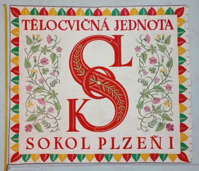 Plátěný oboustranný vyšívaný prapor z r. 1930, rozm. 120 x 110 cm. Prapor pořídili sokolové z vlastní peněžité sbírky.