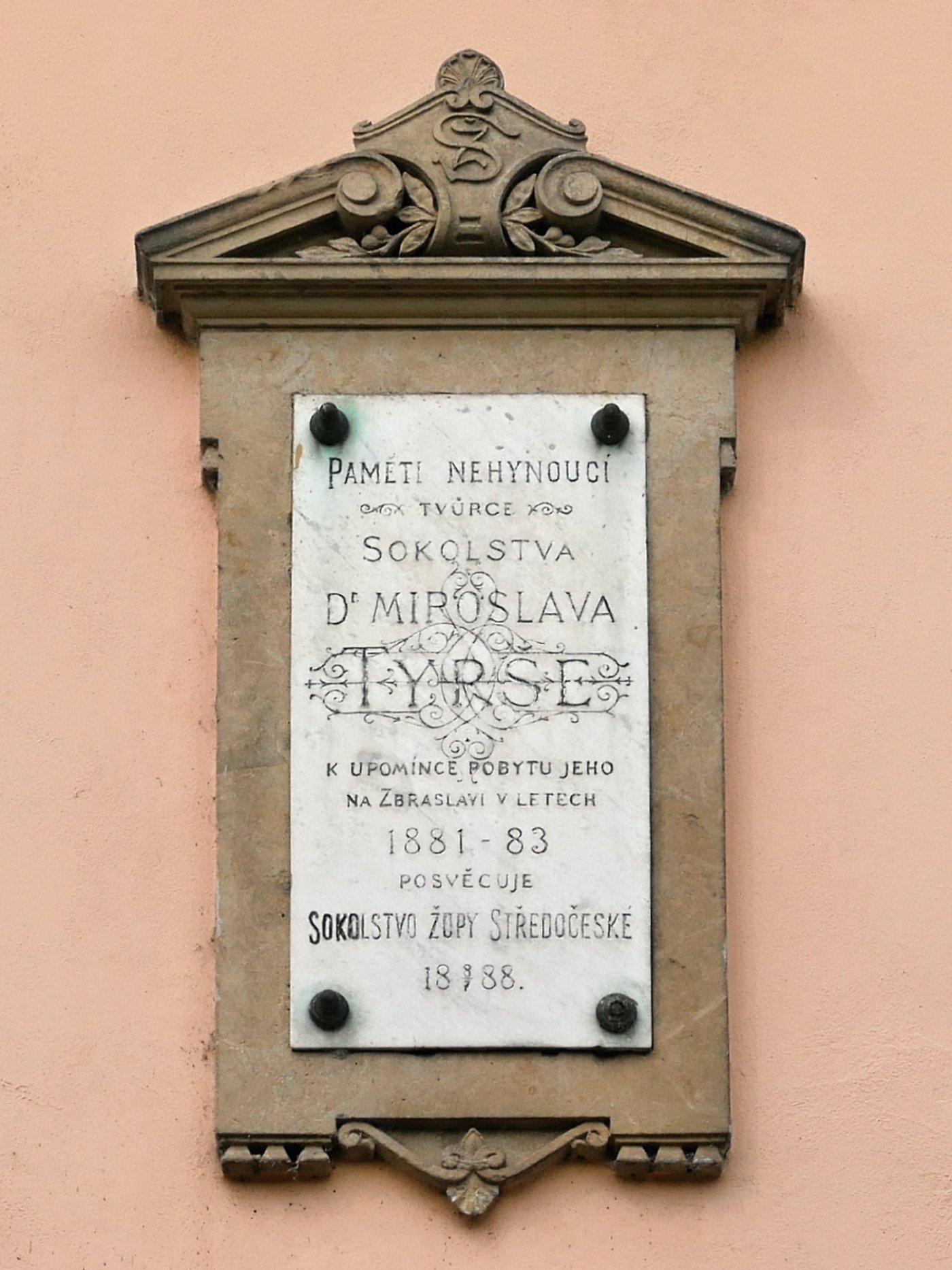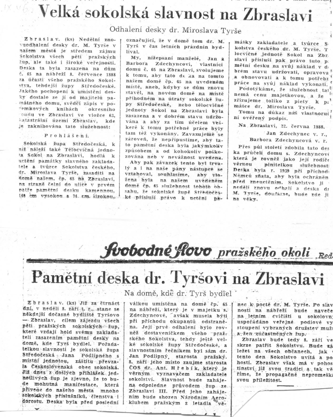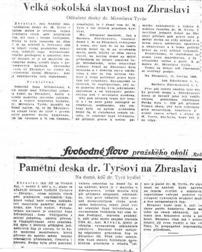 Ze župy středočeské. Slavnost odhaleni desky pamětní, kterou Sokolstvo středočeské posvětilo památce tvůrce Sokolstva, dra. Miroslava Tyrše, a kterou ve Zbraslavi na domě, v němž oslavenec času letního přebýval, zasadí, položena jest ke dni 8. č e r v e n c e t. r. na 3. hod. odpol. Nehlučná slavnost obmezí se na kruh bratrské jednoty pražské, župy středočeské i jednot okolí pražského, v župě nesdružených, ač, jak rozumí se samo sebou, deputace jednot venkovských z jiných žup budou vítány. Pozvání jednot i korporací převzala br. jednota zbraslavská, jíž též buďte přibláiky činěny. Slavnostní řeč prosloví dr. P o d l i p n ý. Vzhledem k době slavnosti ponechává se br. jednotám volnost, spojiti s odpolední slavností dopolední výlet, ježto se nevyjde z Prahy společně; každá jednota pražského rayonu ohlásí účastenství svoje sama pro sebe a to policejnímu řiditelstvuí a okr. hejtmanství smíchovskému, každá jednota vezme tentokráte prapor s sebou. Schůze jednot položena na louku před mostem zbraslavským nejdéle do 3. hod. odpol., kdy hne se průvod, jenž projde městem na nábřeží k domu, kdež slavnostní akt se odbude. Po slavnosti uspořádá Sokol zbraslavský slavnost zahradní. V 9 hodin večer nastoupí se společně zpětný pochod do Chuchle, odkud zvláštním parníkem do Prahy. —