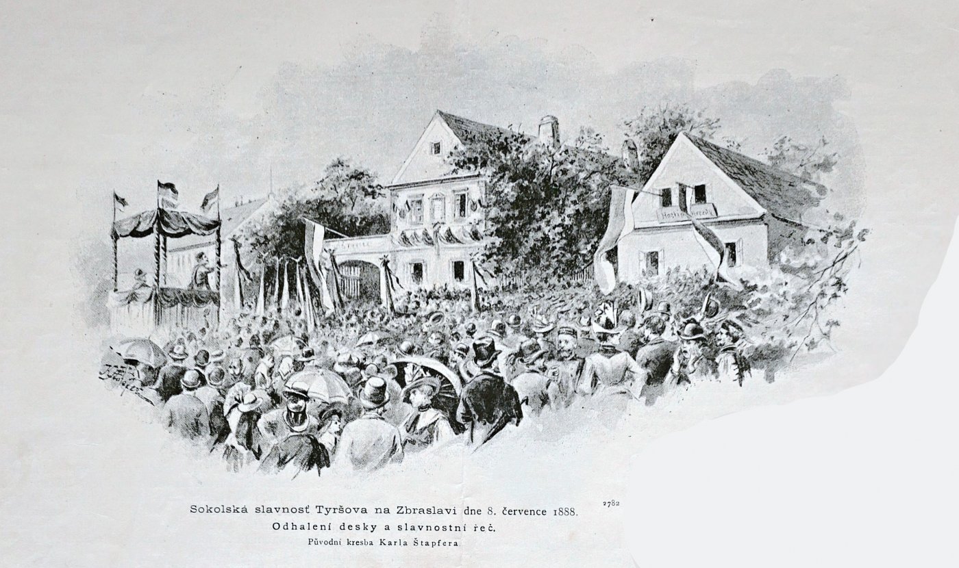 Sokolská slávnosť, odbývaná na Zbraslavi dne 8. t. m, měla rozměry a ráz veliké slavnosti národní. V 33. čísle tohoto ročníku přinesli jsme vyobrazení pamětní desky, kterou Sokol Pražský zasaditi dal ve Zbraslavi na dům, obývaný v letech 1881–1883 nezapomenutelným drem. Miroslavem Tyršem. Odhalení této desky dálo se za přehojného účastenství netoliko jednot Sokolských, v popředí Pražské a také okolních, ale i nepřehledných zástupův vlasteneckého obyvatelstva domácího, Pražského a ze sousedních osad po obou březích Vltavy a Berounky. Střediště slavnosti byla řeč