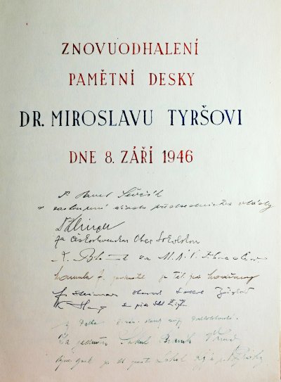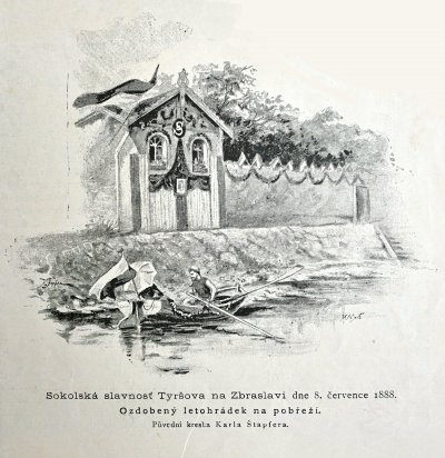 dra. Podlipného, plna národní vroucnosti, sokolské síly, vlasteneckého, povzbuzujícího ohně, řeč, důstojná památky takového muže, jakým byl dr. Miroslav Tyrš, řeč, která zajisté jako plodné, zdárné símě utkvěla v myslech a srdcích všech účastníkův Zbraslavské slavnosti. Velice dojemný а k svému vznešenému účelu úplně přiměřeny byly také zpěvy, pronešené na oslavu zvěčnělého náčelníka Sokolské jednoty Pražské. Zbraslav toho dne skvěla se v nádherném rouše slavnostním, prapory červenobílé vlály s budov, věnce zdobily zejména onu čásť města, kde stojí památné druhdy obydlí Tyršovo. Nadšeni pro myšlénku, jíž dr. Mir. Tyrš věnoval všechny síly svého života, plálo na tvářích tisícův a tisícův. Upřímná, srdečná zábava rozproudila se po skončené slavnosti před pamětní deskou celým městem. I Vltava slavila památku svého druhdy miláčka, zaskvěla se v záři světel a barevných ohňův a poskytovala velmi malebný pohled v širé rovině. Nikdo z účastníkův zajisté po celý život nezapomene na Zbraslavskou slávnosť Tyršovu.
