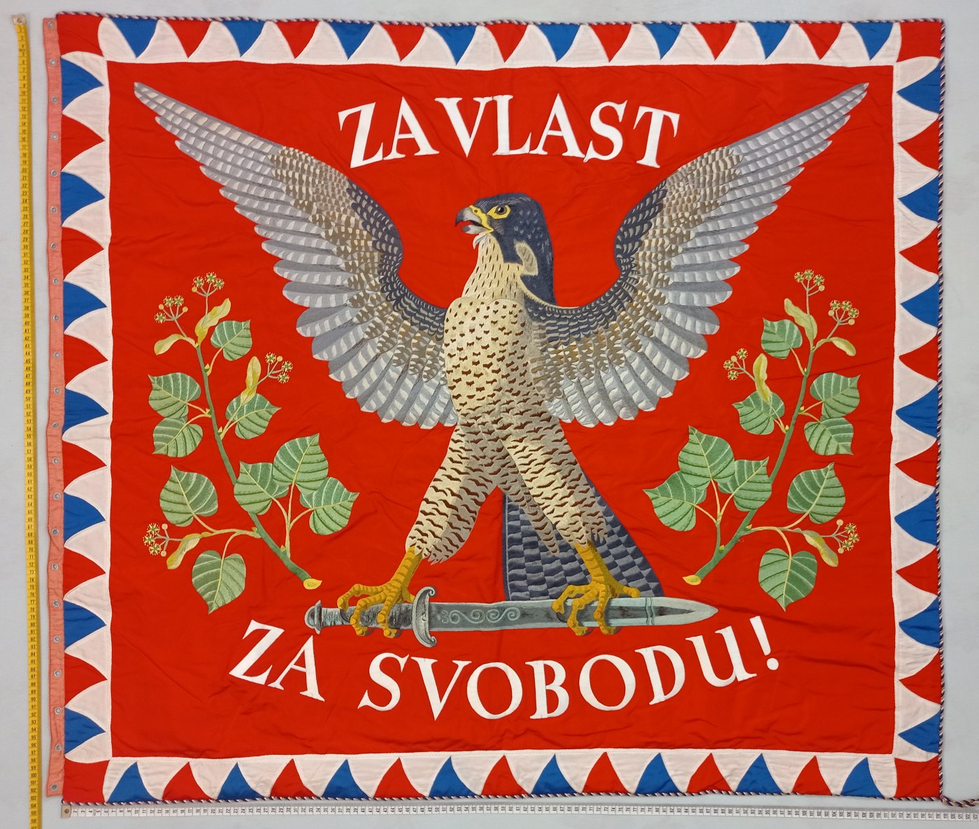 Tento nedávno objevený dvojstranný prapor má rozměry 105x120 cm.