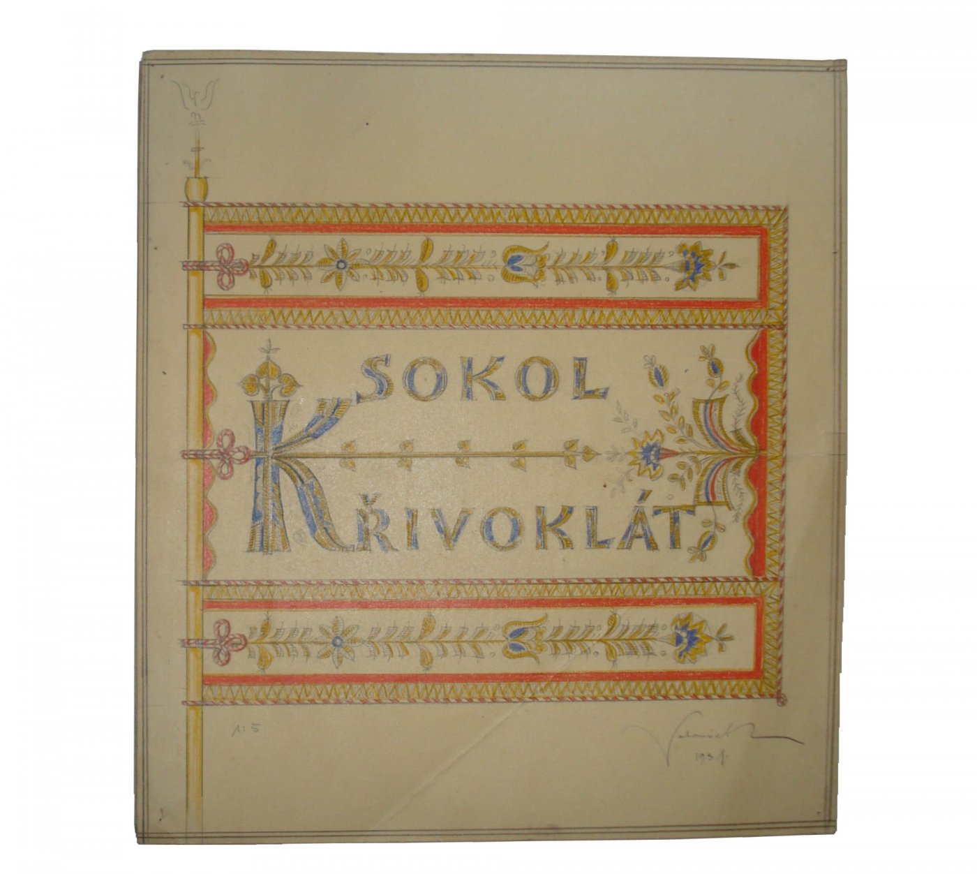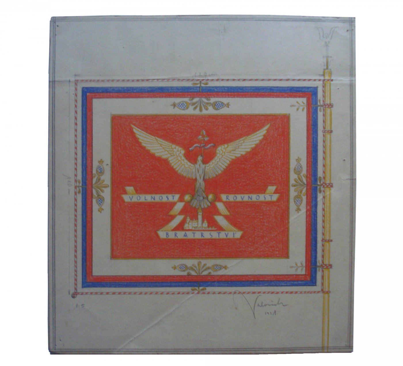 Na začátku roku 1931 se ze zápisů dovídáme, že: „Br. starosta … shledal, že Č.O.S. vypisuje soutěž na prapor jednot, kde bude pravděpodobně dosti návrhů.“ Proto objednávka panu profesorovi Valouškovi byla pozastavena, ale za měsíc na to bylo rozhodnuto přeci jenom návrh na prapor u něho objednat. Do měsíce byl výboru zaslán námět praporu, který „po přehlédnutí přijat, jenom klademe si malou změnu, by hrad Křivoklát, jež je na praporu nastíněn, byl trochu zvětšen“.